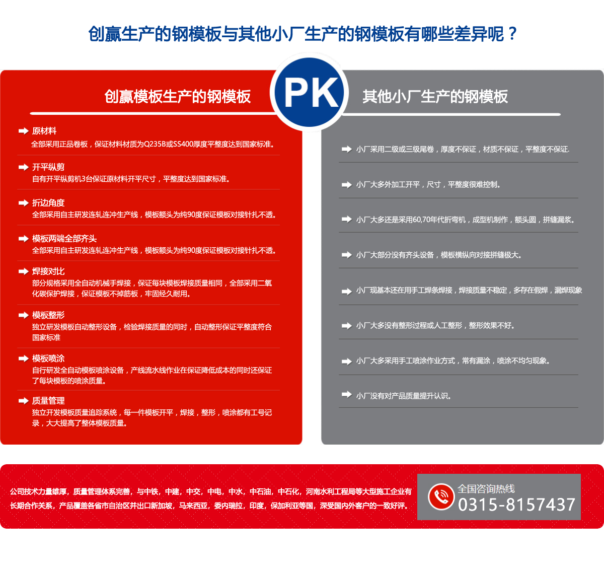 唐山創(chuàng)贏模板有限公司(原唐山豐南雙贏金屬結構廠)始建于一九九七年,是具規(guī)模實力的組合模板生產企業(yè),公司自行設計制造的十二條上卷,連軋,連沖,整形,機械人焊接,調直,噴漆,打包鋼模板生產,實現(xiàn)了自動化一條龍生產,品質優(yōu),效率高,規(guī)格型號為:寬度100-1200mm, 長度300-3000mm, 板厚1.8-4.0mm。